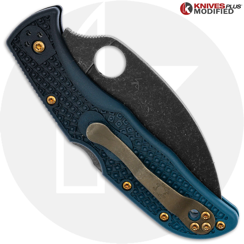 The MODIFIED Spyderco K390 Endela Lightweight Knife, a mid size EDC that ups the ante, features an ACID STONEWASHED 3.41-inch wharncliffe blade made of Bohler-Uddeholm K390 tool steel, .118-inch thick, with a full flat grind, a thumb ramp for secure grip, and the Spyderco hole for ambidextrous one hand opening. The blue FRN (fiberglass nylon resin) handle has been given a black Rit Dye fade starting from the pivot. The dye steadily fades toward the acid stonewashed pocket clip which has also been heat colored. All hardware contrasts nicely with this bronze heat color. The MODIFIED Spyderco Endela Lightweight K390 Knife has an overall open length of 8.10-inches and it weighs 3.1 ounces. Made in Japan.