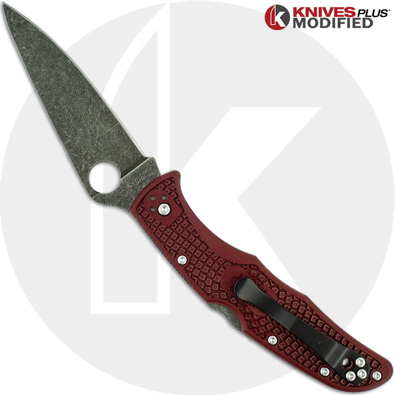 The illustrated Spyderco Knife is the MODIFIED Spyderco Endura4 Lightweight Knife that features an ACID STONEWASHED 3.8" blade made of VG10 stainless steel. The blade of this MODIFIED Spyderco knife has a full flat grind WITH AN ACID WASH, a notched thumb ramp and an enlarged hole for ambidextrous one hand opening. The RIT DYED BURGUNDY fiberglass reinforced nylon handle, 4.98" closed, has Bi-Directional texturing for maximum grip, skeletonized steel liners, a Boye dent lockback, and a lanyard hole. A side to side and end to end reversible black steel pocket clip is included with this Spyderco knife. The MODIFIED Spyderco Endura4 Lightweight Knife with flat ground blade and RIT DYED BURGUNDY handle has an overall open length of 8.78", and it weighs 3.4 ounces. Made in Japan.