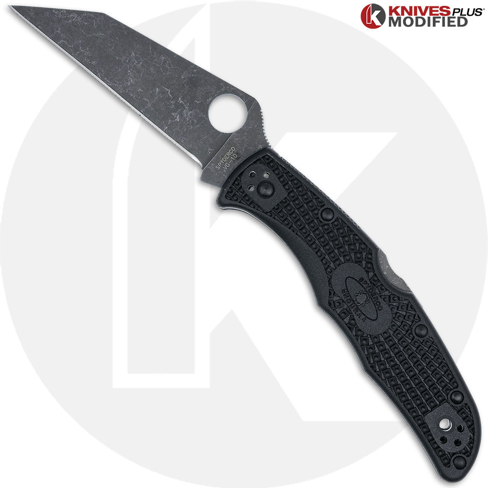 The MOIDIFIED C10FPWCBK Spyderco Endura 4 REGROUND Wharncliffe Knife features an acid stonewashed 3.78 inch REGROUND Wharncliffe blade made of VG-10 stainless steel, .118 inch thick, with a full flat grind, a notched thumb ramp for secure grip, and the Spyderco hole for ambidextrous one hand opening. The black FRN (fiberglass reinforced nylon) handle, 4.98 inches closed, has Bi-Directional Texturing for secure purchase, a lockback, a lanyard hole and a four position steel pocket clip. Hardware has been replaced with our black hardware kit. All satin hardware is included in your package. The Spyderco Endura 4 Wharncliffe Knife has an overall open length of 8.50 inches and it weighs 3.4 ounces. Made in Japan.