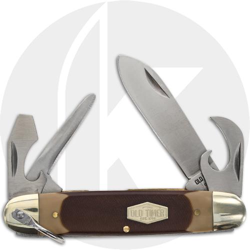 The Old Timer Scout 23OT Knife is a traditional pocket knife that features a drop point blade, a can opener, a bottle opener with screwdriver, and an awl made of 7Cr17MoV high carbon stainless steel, with nail nicks for opening. The brown Sawcut handle, 3.7" closed, has the Old Timer shield, nickel silver bolsters, brass pins and liners, and a bail. The Old Timer Scout Knife weighs .25 pounds. Imported from China.