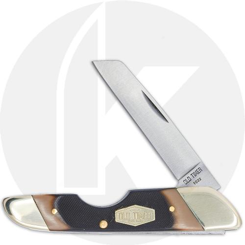 The illustrated Old Timer Knife is the Landshark Old Timer Knife that features a coping blade made of 7Cr17 stainless steel with a nail nick for easy opening. The sawcut brown Delrin handle of this Old Timer knife, 3.7" closed, has steel liners, Old Timer shield inlay and nickel silver bolsters. The Old Timer Landshark Knife is imported from China.