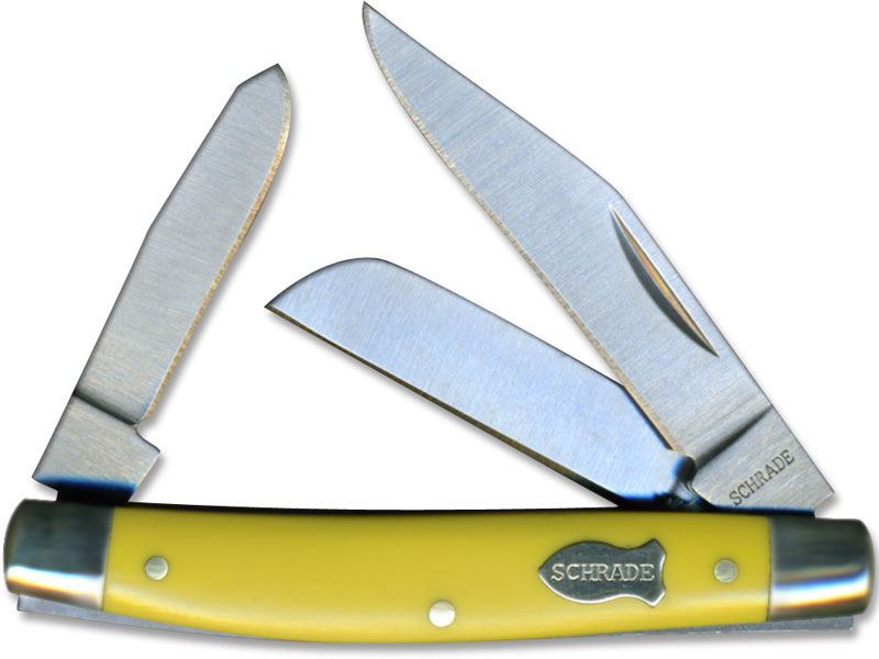 The illustrated Old Timer Knife is the Middleman Old Timer Knife that features clip, spey and sheepfoot blades made of stainless steel. The Yellow composite handle of this Old Timer knife, 3 5/16" closed, has brass liners, Schrade shield and nickel silver bolsters. This Middleman Old Timer Knife is imported.