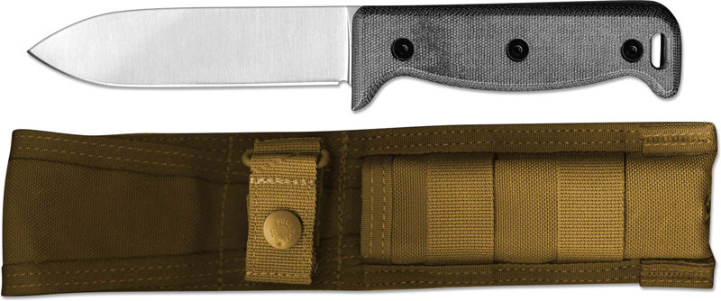 The illustrated Ontario Knife is the Ontario Blackbird SK5, a wilderness survival knife designed by Paul Scheiter, that features a 5" spear point fixed blade made of 154CM stainless steel, .13" thick, with a Rockwell hardness of 58-60. The blade of this Ontario Knife has a full taper grind for maximum carving efficiency, a flat ground edge that is strong and easy to maintain, and an abrupt spine angle that is suitable for use as a striker for a ferro rod fire starter. The Blackbird SK5 Knife has full tang construction for strength; ergonomic canvas Micarta scales for secure grip, a leveled pommel for light duty hammering and a lanyard slot. A MOLLE compatable nylon sheath is included with this Ontario Knife. The Ontario Blackbird SK5 Knife has an overall length of 10". Proudly made in the USA.