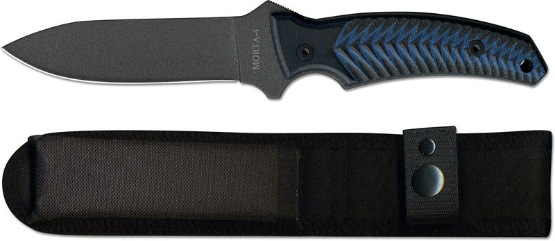 The illustrated Ontario Knife is the Ontario Morta Knife, part of the Fortune Series, that features a 4" spear point fixed blade made of 420HC stainless steel. The blade of this Ontario knife has a non reflective black coated finish and a notched thumb ramp for secure purchase. The Morta Knife has full tang construction for strength, grooved black and blue G10 scales for secure grip and a lanyard hole. A black nylon sheath is included with this Ontario knife. The Ontario Morta Knife has an overall length of 9". Proudly made in the USA.