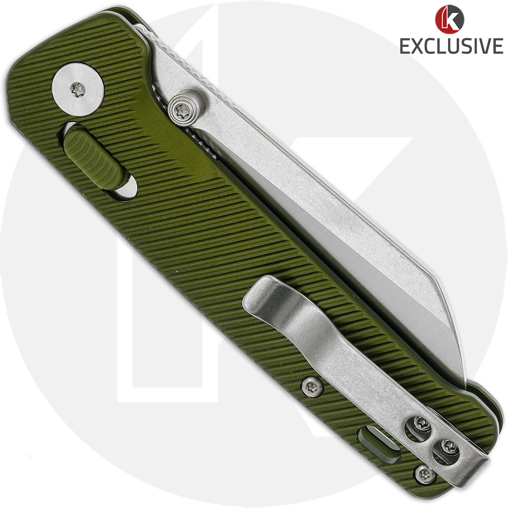 The QS130GL-KPC QSP Penguin is a Knives Plus Exclusive knife that features a 3.06-inch sheepsfoot blade made of CPM S35VN stainless steel with a 2 tone finish, a notched thumb rest for secure grip, and dual thumb studs for ambidextrous one hand opening. The OD green Aluminum handle, 4.00-inches closed, features the Glyde Lock mechanism with an OD green FRN button, stainless steel liners for strength, a lanyard hole, and a side to side reversible deep carry stainless steel pocket clip mounted at the butt end. This QSP Penguin Knife has an overall open length of 7.06-inches, and it weighs 3.1 ounces. Made in China.