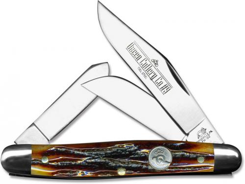 The illustrated Queen Knife is the Queen Large Stockman Knife that features clip, sheepfoot and spey blades made of D2 steel. D2 steel is a high carbon, high chrome steel known for its superior cutting ability, and expertly tempered for a long lasting working edge. The Aged Honey Amber Stag Bone handle of this Queen knife, 4" closed, has brass liners, inlaid Queen shield and nickel silver bolsters. The Queen Large Stockman Knife with Aged Honey Amber Stag Bone handle is proudly crafted in Titusville, Pennsylvania.