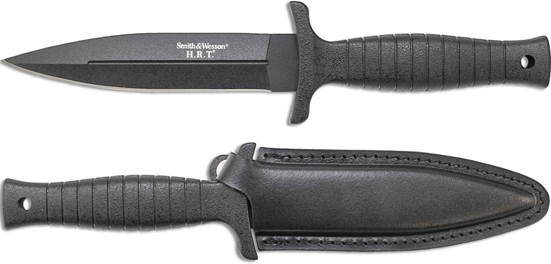 The illustrated Smith and Wesson Knife is the Large S&W HRT9 Knife that features a 6" spear point fixed blade made of 7Cr17MoV high carbon stainless steel. The blade of this Smith and Wesson Knife has a non reflective black finish, the Smith & Wesson H.R.T. logo, fullers and a false top edge. The black TPE (thermoplastic elastomer) handle of this S&W Knife has grooves and an integral cross guard for secure grip, and a lined lanyard hole. A genuine leather boot / belt sheath is included with this S&W Knife. The Large S&W HRT9 Knife with false top edge has an overall length of 11", and it weighs 7.7 ounces. Made in China.