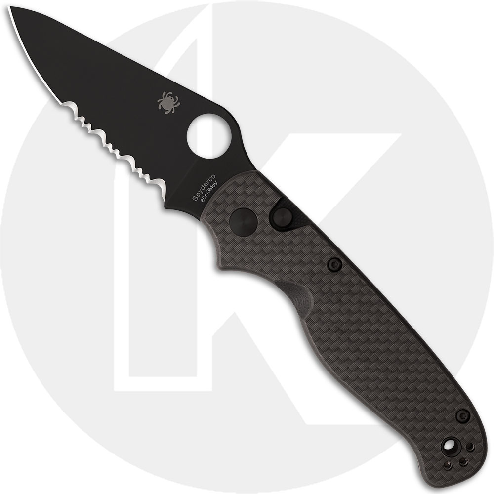 The C275CFPSBK Spyderco ButtonUp knife, designed by Eric Glesser, is Spyderco's first-ever manual-opening button-lock folding pocket knife. This knife features a part serrated 3.27-inch modified clip point blade made of 8Cr13MoV stainless steel, .118-inch thick, with a black oxide finish, a full flat grind, a thumb ramp for comfortable grip, and the Spyderco Trademark Round Hole for ambidextrous one hand opening. The Carbon Fiber/G10 Laminate handle, 4.43-inches closed, has Ball Bearing Washers for smooth opening and closing action, nested stainless steel micro-liners by the pivot/lock and clip, a Button Lock, a lanyard hole, and a side to side reversible pocket clip mounted at the butt end. The Spyderco ButtonUp Knife has an overall open length of 7.5-inches, and it weighs 2.1 ounces. Made in China.