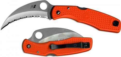 From the Spyderco 2018 Product Guide: The original Spyderhawk Salt was one of the most versatile hawkbill folders produced. Crafted from rustproof H1 steel, its deeply curved, fully serrated blade was ideal for cutting rope, line, and netting - even when wet. That high-performance blade was housed in a tough, one-piece, injection-molded FRN handle and supported by a back lock mechanism and a reversible titanium pocket clip. Based on popular demand, this capable knife is back, distinguished by a high-visibility orange handle. Made in Japan.