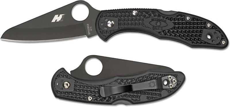 The Spyderco Salt 2 combines the rust proof nitrogen based H-1 steel blade of the original Salt knife with the ergonomic handle of the popular Delica 4. This Salt 2 Knife features a 3.0" modified sheepfoot blade made of rust proof H-1 steel, .098" thick, with a hollow grind, a non reflective black titanium carbonitride finish, a notched thumb ramp for secure grip, and an oversized Spyderco hole for ambidextrous one hand opening. The ergonomic black FRN (fiberglass reinforced nylon) handle, 4.25" closed, has non slip Bi-Directional Texturing, sturdy lockback, a lanyard hole, and a side to side and end to end reversible titanium pocket clip. The Spyderco Salt 2 Knife has an overall open length of 7.25", and it weighs 2.1 ounces. Made in Japan.