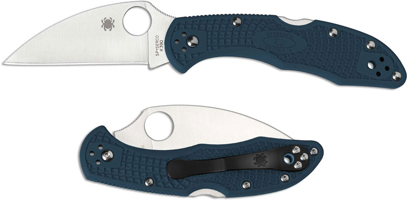 The C11FPWK390 Spyderco Delica 4 Lightweight K390 Wharncliffe Knife is a new iteration of a classic everyday carry that features a 2.87 inch Wharncliffe blade made of Bohler-Uddeholm K390 tool steel, .098 inch thick. The blade has a full flat grind, a notched thumb ramp for secure grip, and the Spyderco Hole for ambidextrous one hand opening. The blue FRN (fiberglass nylon resin) handle, 4.25 inches closed, has ergonomic contours and Bi-Directional Texturing for secure purchase, sturdy lockback, a lanyard hole, and a 4 position steel pocket clip. The Spyderco Delica 4 Lightweight K390 Wharncliffe Knife has an overall open length of 7.12 inches, and it weighs 2.4 ounces. Made in Japan.