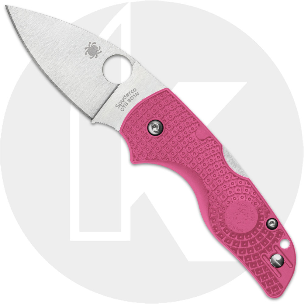 The C230PPN Spyderco Lil' Native Lightweight Knife features a 2.42-inch leaf-shaped blade made of the CTS BD1N stainless steel, .098-inches thick, with a satin finish, full flat grind and the Spyderco hole for ambidextrous one hand opening. The ergonomic, lightweight pink FRN handle, 3.47-inches closed, has a sturdy Back Lock and a side to side reversible wire clip mounted at the butt end. The Spyderco Lil' Native Lightweight has an overall open length of 5.9-inches and it weighs 1.6 ounces. Made in the USA.