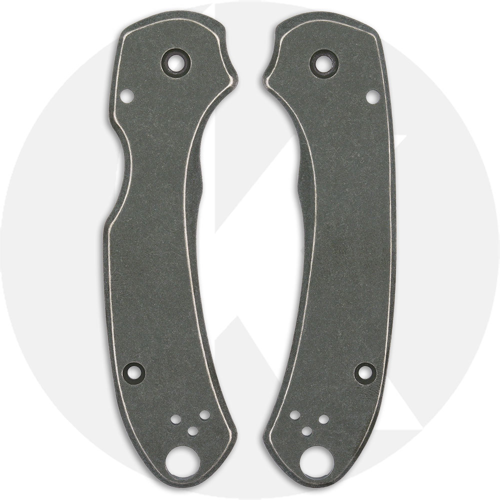 The Knives Plus replacement titanium scales for the Spyderco Para 3 are precision milled from 6AL4A titanium with a smooth, flat surface (perfect for engraving), the AWT skinny cut, a Panzer Green Cerakote, and a stonewash finish. These scales were created to replace the original Spyderco Para 3 scales.