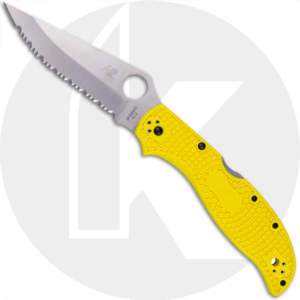 The C258SYL Spyderco Stretch 2 XL Lightweight Salt knife features a 3.99 inch serrated drop point blade made of H-2 rust-proof stainless steel, .118 inches thick, with a straight spine, a full flat grind, notched thumb ramp, and the Spyderco hole for ambidextrous one hand opening. The yellow FRN (fiberglass reinforced nylon) handle, 4.97 inches closed, has ergonomic contouring and Bi-Directional Texturing for secure grip, sturdy back lock, a lanyard hole, and a 4 position steel pocket clip. The Spyderco Stretch 2 XL Lightweight Knife has an overall open length of 8.90 inches and it weighs 3 ounces. Made in Japan.