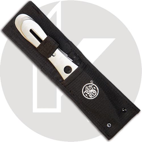 The illustrated Smith and Wesson Knife Set is the S&W Bullseye Throwing Knife Set - a set of six throwers that feature single piece 2Cr13 stainless steel construction with a double edge blade area and a slotted handle. A combo polyester sheath is included with this S&W Knife Set. Each of the throwing knives measures 8.0" overall. Made in China.