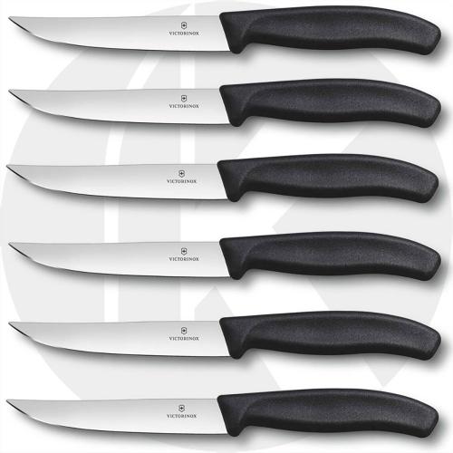 This Victorinox Gaucho Steak Knife Set includes six knives - each has a 4 1/2 stainless steel blade and a black synthetic handle. Overall length is 9 1/16 inches. Made in Switzerland.