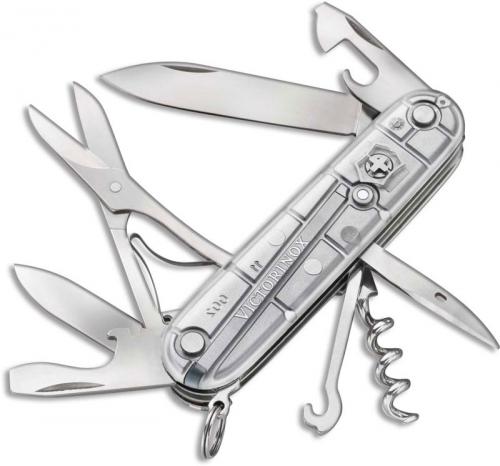 The illustrated Victorinox Knife is the Climber Knife with Silver Tech handle. The components of this Victorinox Knife include a large blade, small blade, corkscrew, can opener with small screwdriver (also for Phillips screws), bottle opener with large screwdriver and wire stripper, reamer with sewing eye, multi purpose hook (parcel carrier), scissors, toothpick, tweezers and key ring. The Victorinox Climber Knife with Silver Tech handle has a closed length of 3 1/2".