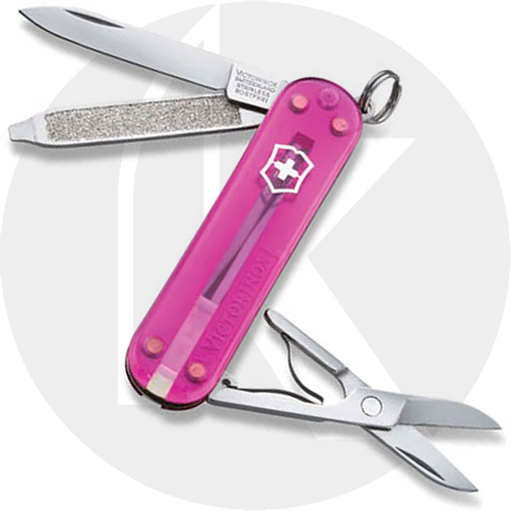 The illustrated Victorinox Knife is the Victorinox Classic SD Knife with Translucent Pink handle. The components of this Victorinox Knife include a blade, nail file with screwdriver tip, scissors, toothpick, tweezers, and a key ring. The Victorinox Classic SD Knife with Translucent Pink handle has a closed length of 2 1/4".