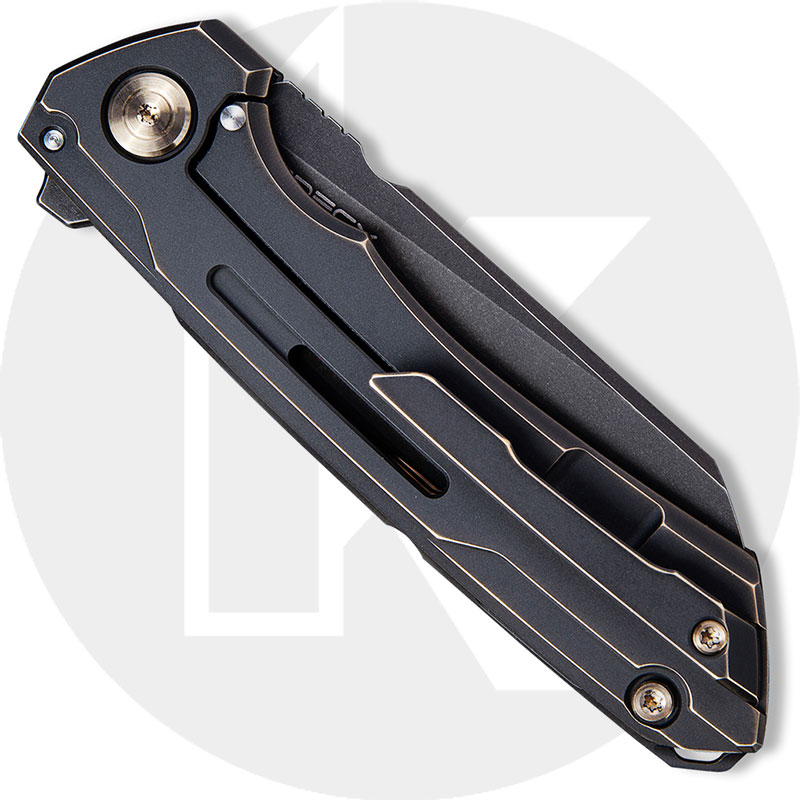 The 2003B WE Knife Company Mini Buster is a sleek everyday carry, designed by Snecx Tan, that features a 3.43 inch Wharncliffe blade made of premium CPM 20CV stainless steel, .16 inches thick, with a Rockwell hardness of 58-60, a black stonewash finish, notched thumb rest for secure purchase, and a low profile flipper for ambidextrous one hand opening. The contoured 6AL4V titanium handle, 4.54 inches closed, has an Antique Bronze finish, pivot with caged double row ceramic ball bearing support for smooth opening, Antique Bronze titanium backspacer for strength, sturdy frame lock, and a matching titanium pocket clip mounted at the butt end. This WE Knife Company Mini Buster has an overall open length of 7.97 inches, and it weighs 4 ounces. Made in China.